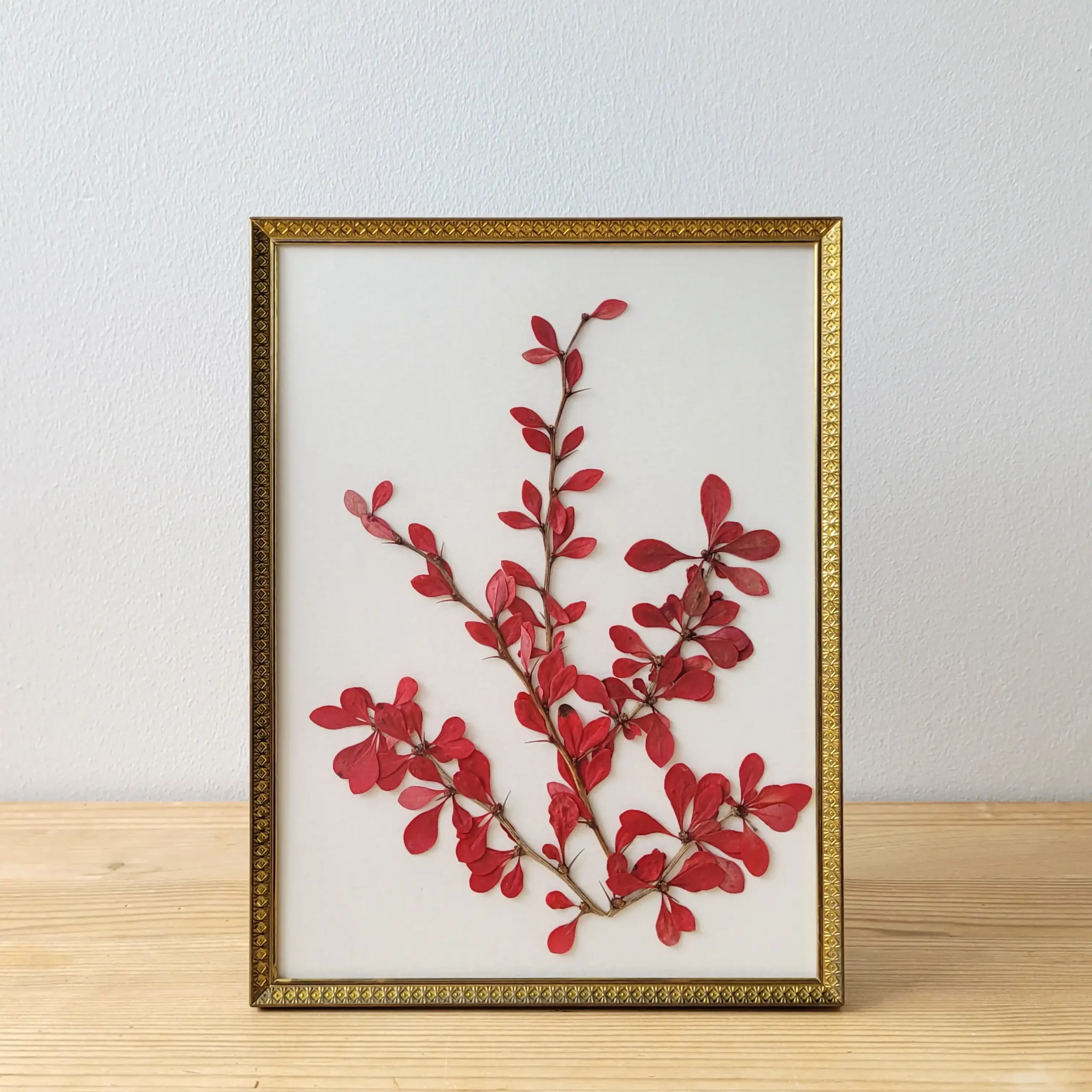 Vintage metalen fotolijstje met echte takjes geperste Japanse berberis.